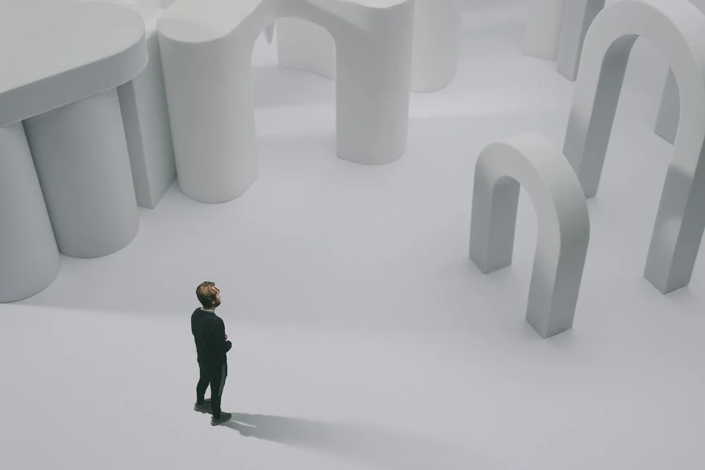 Person in black clothes stands in a minimalist setting with large white geometric shapes and arches.